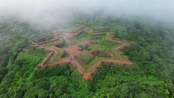 “Manjarabad” derives from the Kannada word “Manju,” meaning “mist” or “fog.” If one goes to this site in the rainy season during June to September, it is an incredible experience. When one starts at the base of the fort near the NH-75 roadway, the climate is humid and there is the smell of damp coffee hulls from the various coffee plantations. As you go up the granite steps, the temperature drops by the time you arrive at the main entrance to the fort, the “Abode of Fog,” and the visibility drops to around 5 ft, making the fort look like a ghost ship floating in a sea of white.