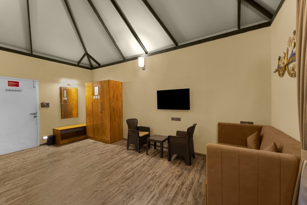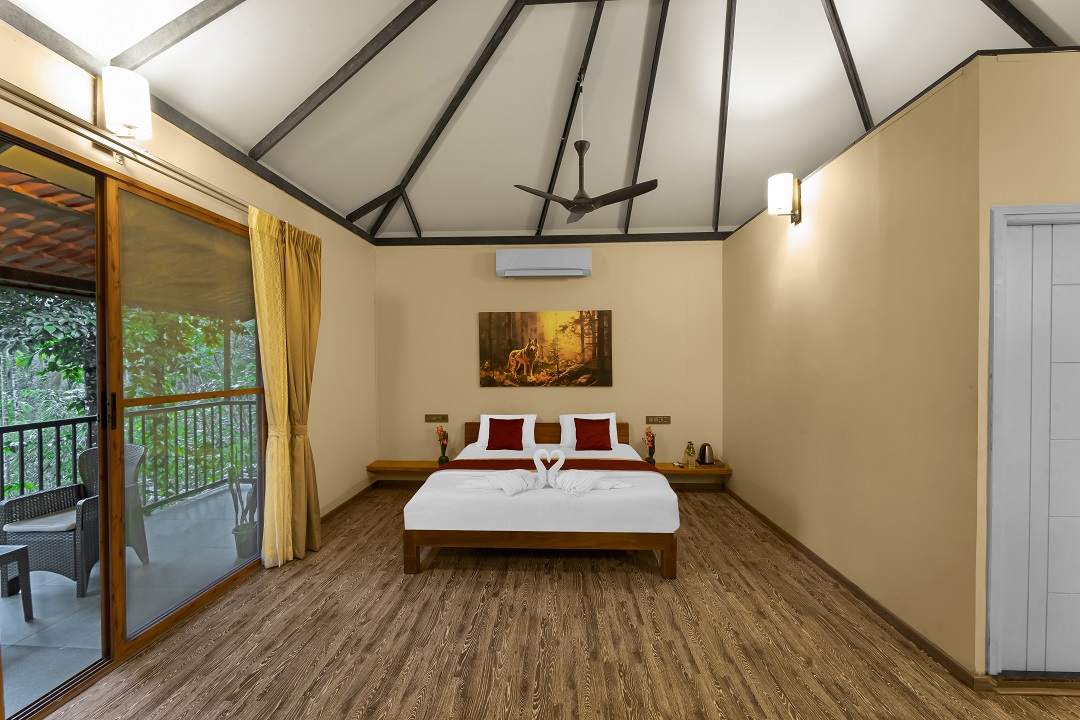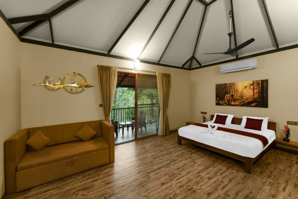 The Premium AC Suite is a luxurious room designed for couples who wish to indulge in comfort and nature together. This elegant suite features Air conditioning, Smart TV, kettle and a cozy sofa-bed, along with a private balcony overlooking lush greenery plantations and a serene stream view making it the perfect choice for a romantic and memorable getaway.