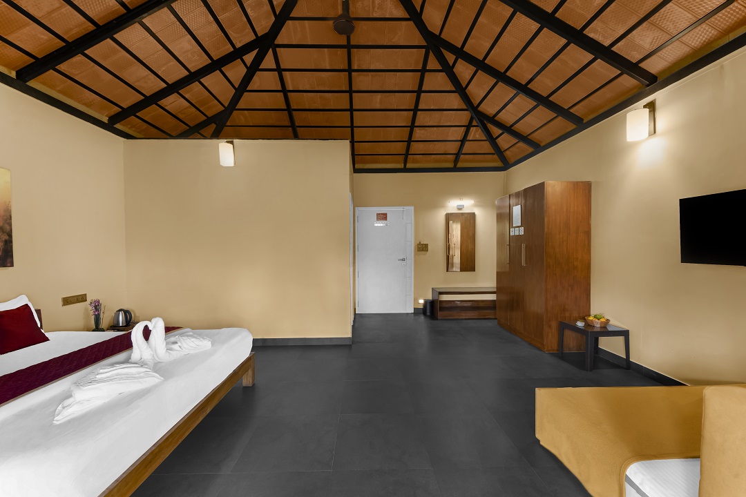 Its is a luxurious room designed for 3 – 4 guests, who wish to indulge in comfort and nature together. This elegant suite features Air conditioning, Smart TV, kettle and a cozy sofa-bed, along with a private balcony overlooking lush greenery plantations and a serene stream view making it the perfect choice for a romantic and memorable getaway.